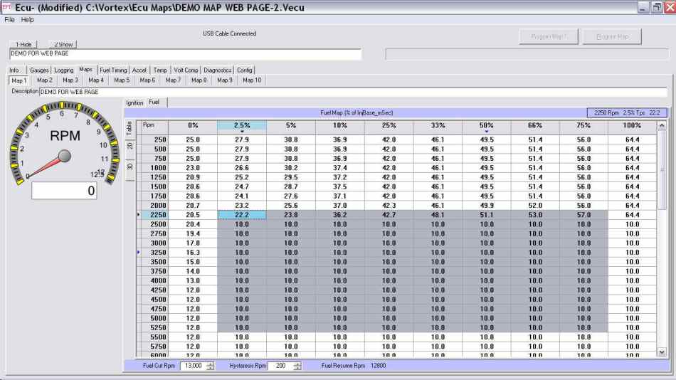 This ECU Software is a powerful tool which offers full programmability of the Vortex ECU and encompasses many features far surpassing any factory setting tools available from the OE manufacturers. Included in the software is the ability to view real time data from the engine sensors in both a graphical and digital representation. Engine sensor diagnostics and the ability to interface to a wdieband Air/Fuel sensor will allow logging of Air / Fuel readings from future products. The graphical user interface allows the user to view or edit the high resolution Fuel and Ignition maps in either Table, 2D or 3D modes also allows programming throttle enrichment, fuel injection timing, rev limits, trim tables and much more.