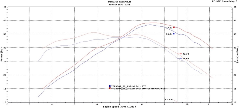 Performance gains vary depending on Throttle and RPM points however typically gains are in Top End power and Bottom End throttle response is expected from the "Power" settings and a smoother more tractable or rideable power from the "Traction" settings.